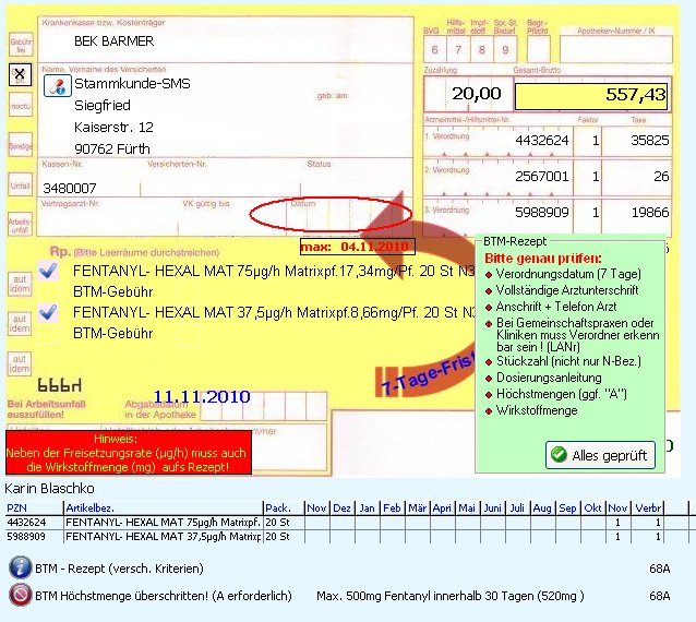 Sollte diese Warnung erscheinen, muss auf dem Rezept ein A stehen, um die Überschreitung als absichtlich zu kennzeichnen. Dies darf auch durch den Apotheker 'geheilt' werden. Der Arzt muss aber informiert werden, damit auf der in der Praxis verbliebenen Kopie das A ebenfalls aufgetragen wird.
