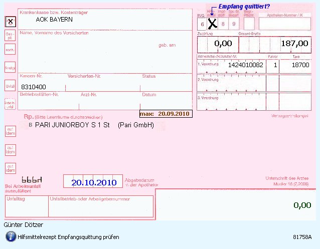 Viele Rahmenverträge mit den Kassen verlangen bei der Abgabe von Hilfsmittel eine Empfangsbestätigung des Patienten. Falls das bei Ihren Kassen nicht der Fall sein sollte, können Sie diese Prüfung ausblenden (Menü Datei-Filtereinstellungen)